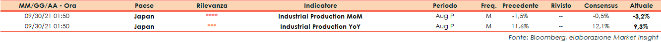 Secondo la lettura preliminare del Ministero dell’Economia, del Commercio e dell’Industria giapponese, ad agosto il dato preliminare sulla produzione industriale segna un -3,2% su base mensile, dopo il -1,5% del dato finale di luglio. Gli analisti si attendevano un valore di -0,5%.