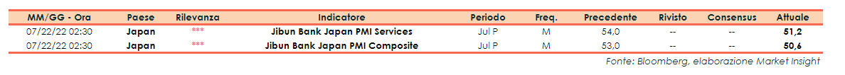Il dato preliminare di luglio del PMI servizi della Jibun Bank giapponese si è attestato a 51,2 punti, dopo i 54 punti di giugno. Ad maggio il dato segnava 52,6 punti.