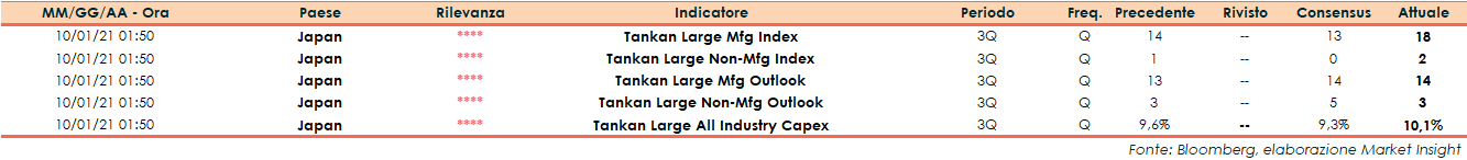 Dalla lettura odierna degli Indici Tankan, rilasciati dalla Banca centrale Giappone sul terzo trimestre del 2021 emerge quanto segue: