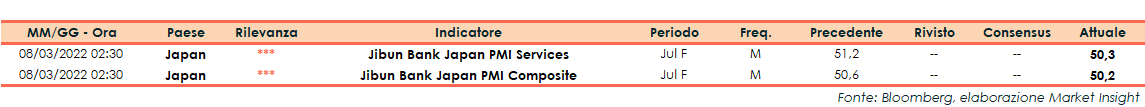 Il dato finale di giugno del PMI servizi della Jibun Bank giapponese si è attestato a 50,3 punti, in rallentamento rispetto a 51,2 punti della rilevazione preliminare.