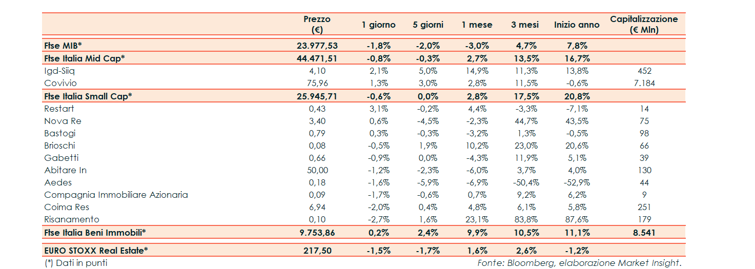 Ieri il FTSE Italia Beni Immobili ha guadagnato lo 0,2%, sovraperformando il corrispondente indice settoriale europeo (-1,5%) e il principale indice di Milano (-1,8%).