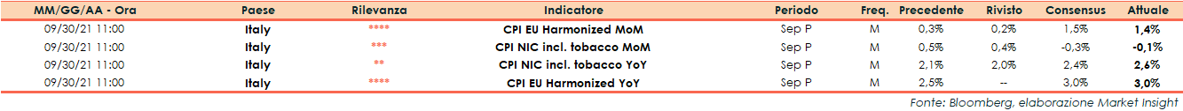 Italia – A settembre CPI preliminare armonizzato EU +1,4% m/m e +3% a/a, in linea con attese