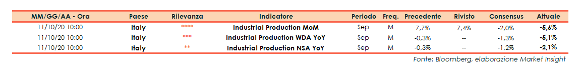 L’Istat ha reso noto che a settembre 2020 la produzione industriale ha riportato un calo del 5,6% su base mensile (consensus -2%). Ad agosto il dato aveva registrato un aumento del 7,4% (rivisto da +7,7%).
