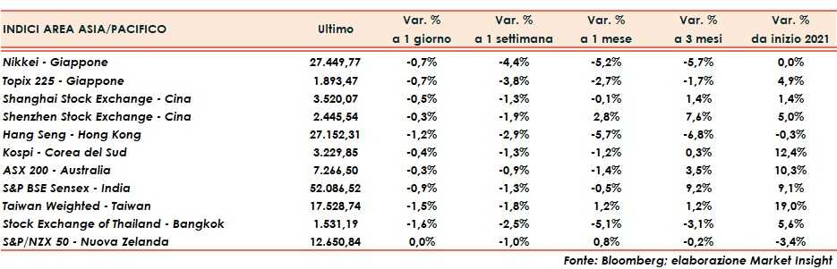 Tornando ai listini asiatici, chiuse le piazze di Singapore, Indonesia e Malesia. In Cina Shanghai e Shenzhen in flessione rispettivamente dello 0,5% e dello 0,3%. Hong Kong a -1,2%.