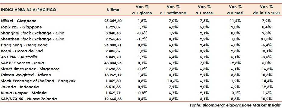 Nel frattempo in Asia si sono registrate forti vendite sui titoli del settore tecnologico, tra cui Alibaba (-8,3% a Hong Kong) dopo la notizia che l’autorità cinese per la regolamentazione dei mercati ha redatto una serie di norme volte a prevenire comportamenti monopolistici da parte delle piattaforme Internet.
