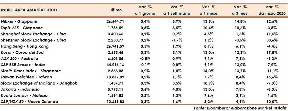 Seduta positiva per i principali listini asiatici in un clima che beneficia delle speranze sui vaccini e sulla ripresa economica, anche se il sentiment resta condizionato dalla pandemia e dalle restrizioni alle attività.