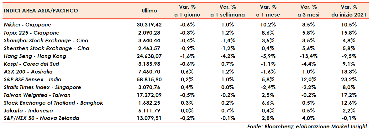 Tornando ai listini asiatici, in Cina Shanghai e Shenzhen cedono rispettivamente lo 0,4 e lo 0,9%. Hong Kong a -1,6%.