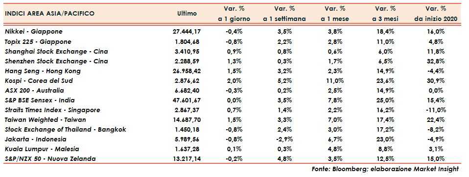 Negativi i listini giapponesi, dopo che nella giornata di ieri il Nikkei aveva toccato nuovi record dal 1990. Positivi invece i listini cinesi con l’indice delle blue chip CSI300 che ha raggiunto il suo record degli ultimi 5 anni.
