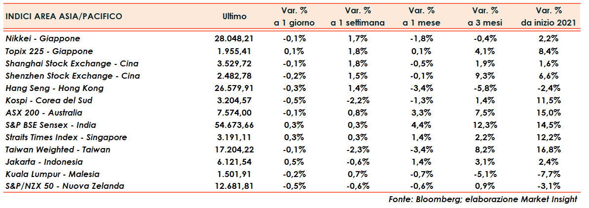 Le tempistiche del tapering delle misure di sostegno all’economia da parte delle banche centrali restano comunque al centro del dibattito sui mercati, dato che ci vorranno ancora alcuni mesi per stabilire se l’accelerazione dell’inflazione sia effettivamente da considerarsi transitoria o meno.