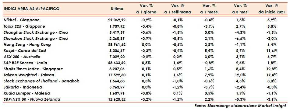 Listini asiatici perlopiù deboli con gli investitori che restano focalizzati sulle banche centrali, i segnali provenienti dai risultati corporate e dai dati macro, oltre che sull’avanzamento della pandemia.