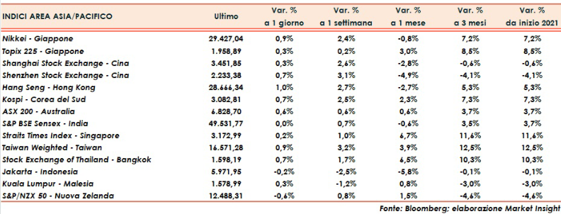 Tornando ai listini asiatici, in Cina Shanghai e Shenzhen guadagnano rispettivamente rispettivamente lo 0,3% e lo 0,7%. Hong Kong a +1%.