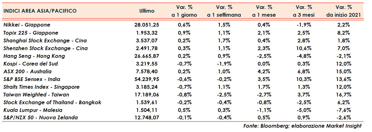Altra seduta prudente per i principali listini asiatici con gli investitori che continuano a monitorare l’evoluzione della pandemia e i segnali di un’eventuale riduzione degli stimoli monetari da parte delle banche centrali.