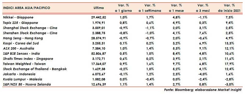 in Giappone il Nikkei e il Topix guadagnano rispettivamente l’1% e lo 0,8%.