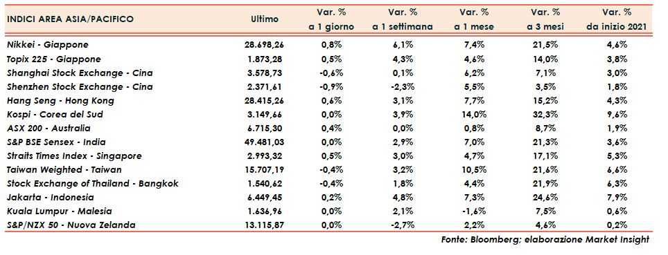 In Giappone il Nikkei e il Topix guadagnaro rispettivamente lo 0,8% e lo 0,5%.