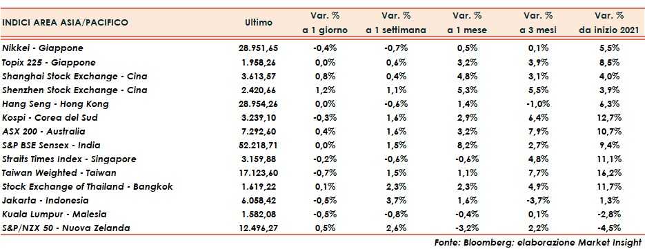 Tornando ai listini asiatici, in Cina Shanghai e Shenzhen guadagnano rispettivamente lo 0,8% e l’1,2%. Hong Kong si muove sulla parità (0,0%).