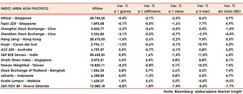 In Giappone, Nikkei e Topix registrano rispettivamente un -0,4% e un -0,1%.