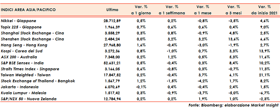 Il tutto dopo le seguenti chiusure di ieri di Wall Street: Dow Jones (+0,4%), Nasdaq (+0,2%) e S&P 500 (+0,3%).