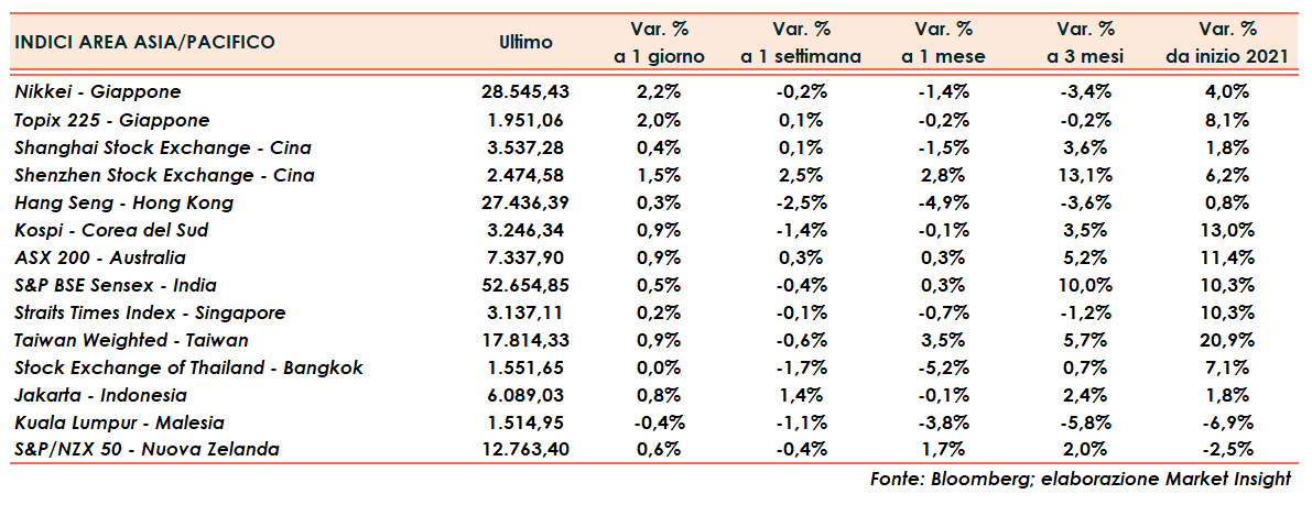 In Giappone il Nikkei e il Topix salgono rispettivamente del 2,2% e del 2%.