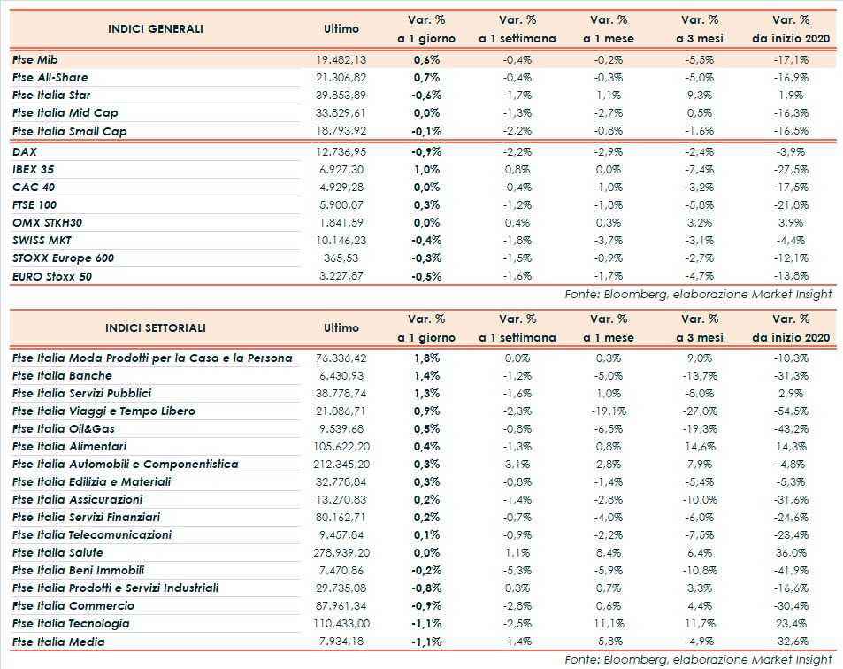 A Piazza Affari il Ftse Mib archivia gli scambi in rialzo dello 0,6% a 19.482 punti, positivo come l’Ibex35 di Madrid (+1%) e il Ftse 100 di Londra (+0,3%). Flat il Cac 40 di Parigi mentre arretra il Dax di Francoforte (-0,9%).