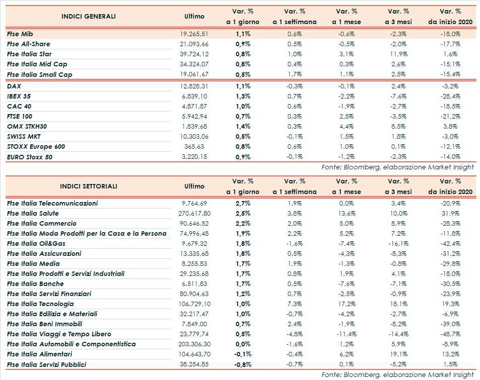 A Piazza Affari il Ftse Mib termina in rialzo dell’1,1% a 19.265 punti, ben intonato come l’Ibex 35 di Madrid (+1,3%), il Dax di Francoforte (+1,1%), il Cac 40 di Parigi (+1,0%) e il Ftse 100 di Londra (+0,7%).