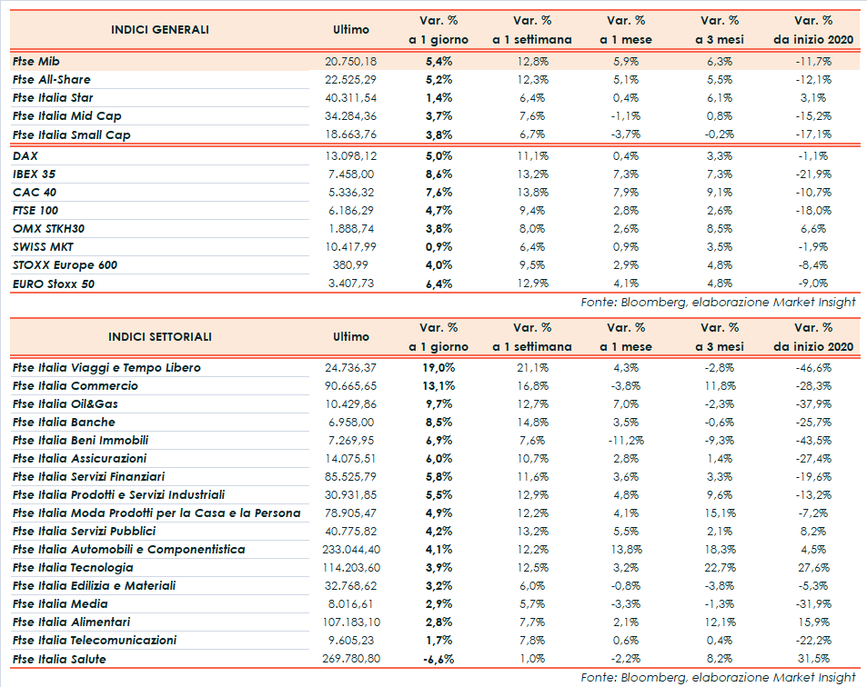 A Piazza Affari il Ftse Mib archivia gli scambi in rialzo del 5,4% a 20.750 punti. Seduta in spolvero anche per Ftse 100 di Londra (+4,7%), Dax di Francoforte (+5,0%), Cac 40 di Parigi (+7,6%) e Ibex 35 di Madrid (+8,6%). Oltreoceano corrono Dow Jones (+4,0%) e S&P500 (+2,9­%), più moderato il Nasdaq (+1,2%) che ha sovraperformato gli altri indici nelle ultime sedute e da inizio anno.
