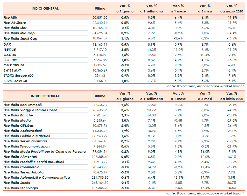 Oltreoceano avanzano Dow Jones (+0,5%) e S&P500 (+0,4%), mentre arretra il Nasdaq (-1,3%) in scia alla rotazione settoriale che sta portando a ridurre le posizioni nei titoli tecnologici per scommettere sul rimbalzo dei comparti più penalizzati negli ultimi mesi dalla pandemia.