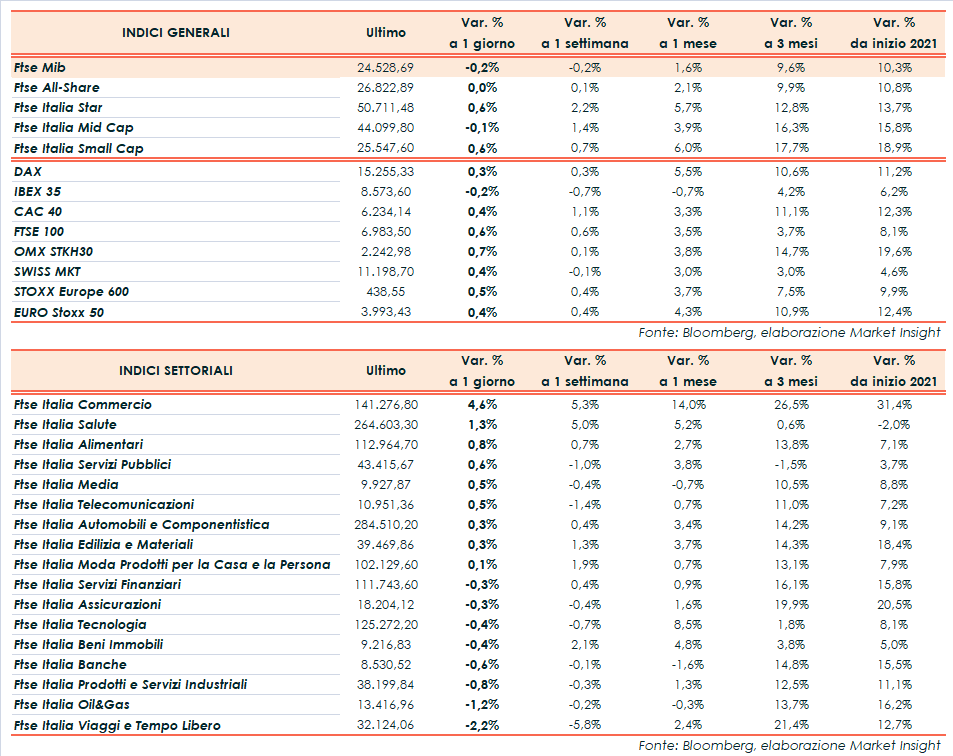 Chiusura in ordine sparso per gli eurolistini, con il Ftse Mib in frazionale ribasso (-0,2%) a 24.528 punti. Debole anche l’Ibex 35 di Madrid (-0,2%), in lieve rialzo il Dax di Francoforte (+0,3%), il Cac 40 di Parigi (+0,4%) e il Ftse 100 di Londra (+0,7%).