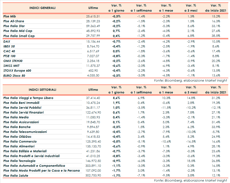 Il sentiment sui mercati resta diviso tra l’ottimismo per la ripresa dell’economia e le preoccupazioni legate soprattutto alle pressioni inflazionistiche, con l’indice Pce statunitense ai massimi dal 1991, e al prossimo avvio del tapering da parte della Fed. A ciò si aggiungono le preoccupazioni per i colli di bottiglia nella supply-chain globale, la crisi energetica e la stretta regolamentare di Pechino.