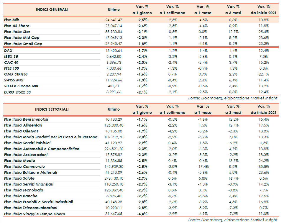 A Piazza Affari il Ftse Mib termina in ribasso del 2,5% a 24.641 punti, negativo come l’Ibex 35 di Madrid (-2,4%), il Cac 40 di Parigi (-2,0%), il Dax di Francoforte (-1,7%) e il Ftse 100 di Londra (-1,7%). Arretrano anche i listini americani Dow Jones (-0,8%), S&P500 (-1,0%) e Nasdaq (-1,1%), gli ultimi due dopo i record della seduta precedente.