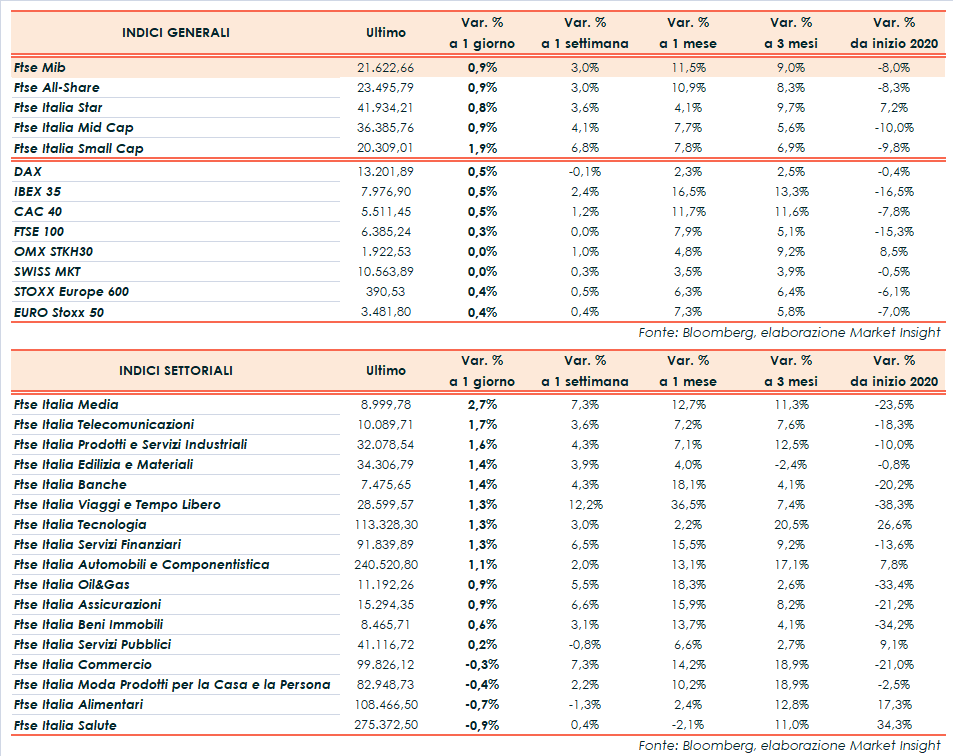 Il Ftse Mib di Milano chiude in vetta al Vecchio Continente con un progresso dello 0,9% in area 21.622 punti. Più arretrati il Ftse 100 di Londra (+0,3%), il Dax di Francoforte (+0,5%), l’Ibex 35 di Madrid (+0,5%) e il Cac 40 di Parigi (+0,5%). Oltreoceano, proseguono poco mossi Dow Jones (+0,4%), S&P500 (+0,2%) e Nasdaq (flat).