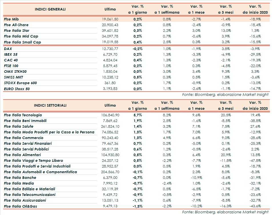 A Piazza Affari il Ftse Mib termina in progresso dello 0,2% a 19.061 punti, lievemente positivo come il Ftse 100 di Londra (+0,2%), l’Ibex 35 di Madrid (+0,2%) e il Cac 40 di Parigi (+0,4%), mentre il Dax di Francoforte arretra dello 0,2%.