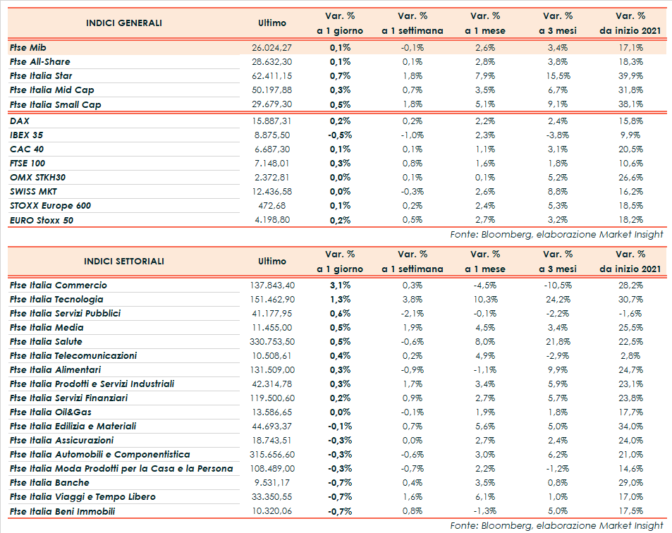 Nel complesso l’azionario globale beneficia delle rassicurazioni di Jerome Powell, presidente della Fed, che venerdì ha chiarito l’intenzione di ritirare gradualmente e con cautela gli stimoli a supporto dell’economia. In particolare, la banca centrale americana potrebbe avviare entro fine anno la riduzione degli acquisti di asset ma non ha fretta di alzare i tassi di interesse.