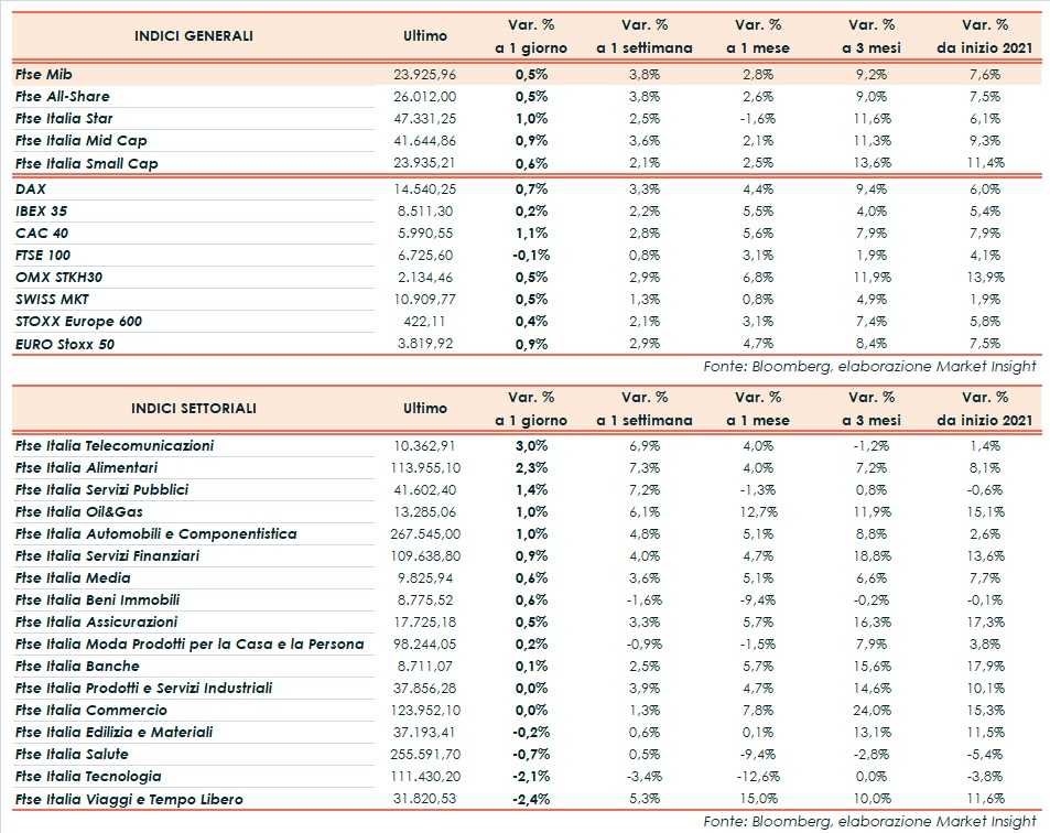 A Milano il Ftse Mib termina in progresso dello 0,5% in area 23.925 punti, ben intonato come il Cac 40 di Parigi (+1,1%), il Dax di Francoforte (+0,7%) e l’Ibex 35 di Madrid (+0,2%) mentre il Ftse 100 di Londra resta poco mosso (-0,1%). Oltreoceano rallenta il Nasdaq (+0,3%) dopo una partenza con guadagni oltre l’1%. Si mantengono positivi Dow Jones (+1,2%) e S&P500 (+0,7%).