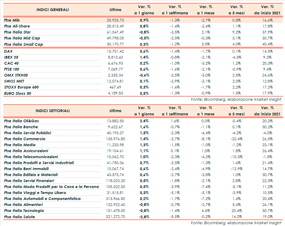Giornata all’insegna degli acquisti per le borse europee, mentre a Wall Street viaggiano contrastati Dow Jones (+0,8%), S&P500 (+0,1%) e Nasdaq (-0,3%). A Milano il Ftse Mib chiude in progresso dello 0,9% a 25.925 punti, positivo come l’Ibex 35 di Madrid (+1,4%), il Dax di Francoforte (+0,6%) e il Ftse 100 di Londra (+0,6%), più arretrato il Cac 40 di Parigi (+0,2%).
