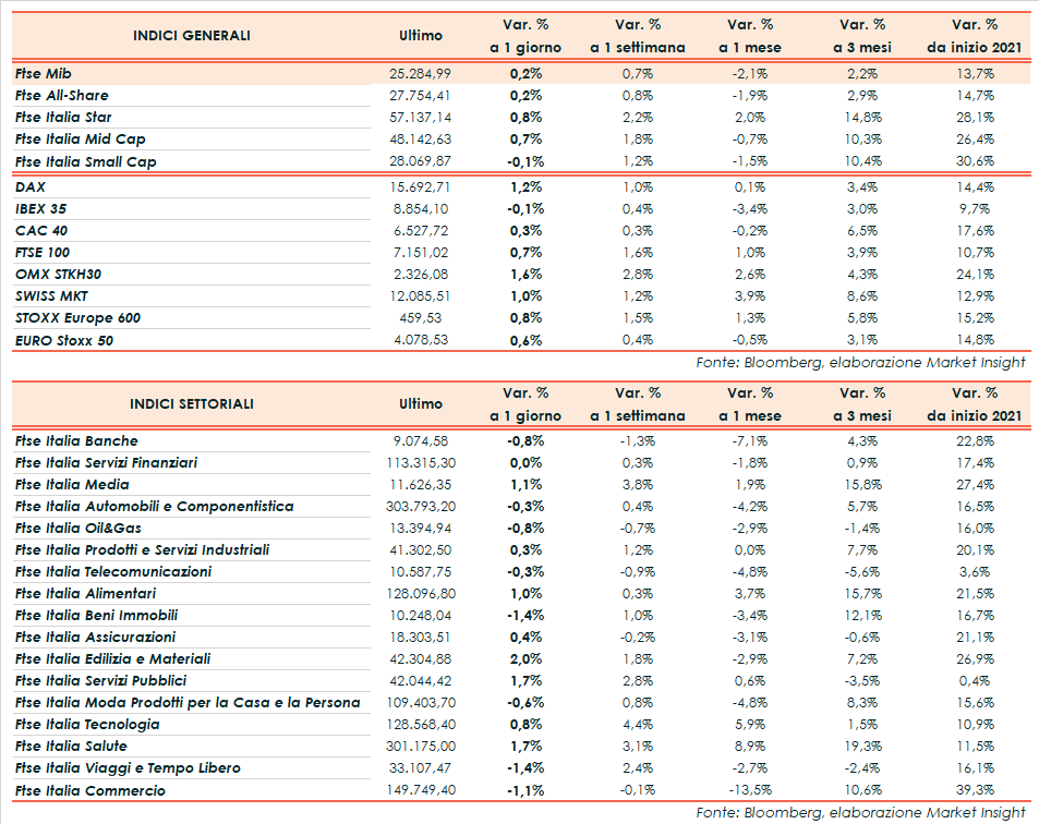 A Piazza Affari il Ftse Mib termina in rialzo dello 0,2% a 25.284 punti. Guadagni più consistenti per il Dax di Francoforte (+1,2%) e il Ftse 100 di Londra (+0,7%), più arretrati il Cac 40 di Parigi (+0,3%) e l’Ibex 35 di Madrid (-0,1%).