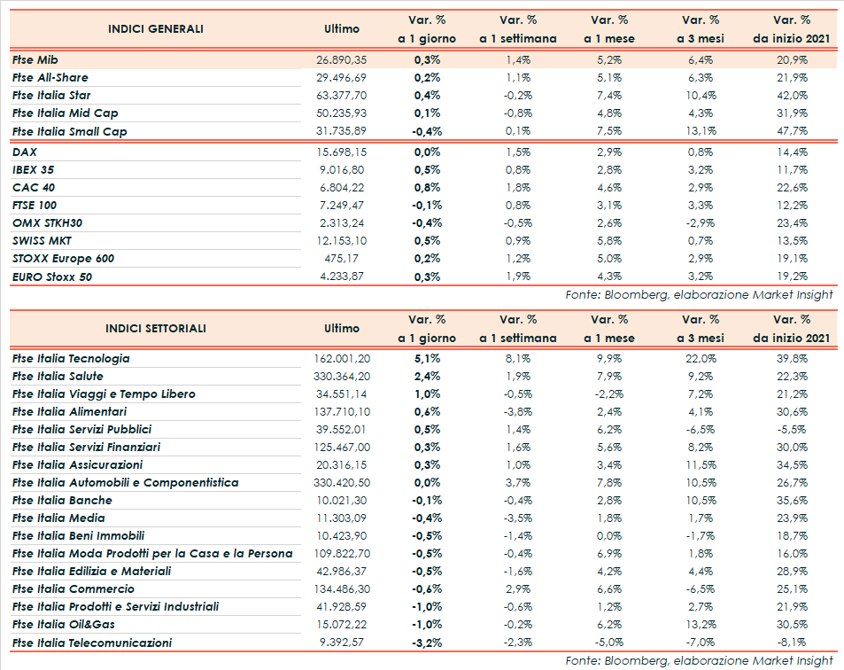 A Piazza Affari il Ftse Mib archivia gli scambi in progresso dello 0,3% a 26.890 punti, sopra la parità come il Cac 40 di Parigi (+0,8%) e l’Ibex 35 di Madrid (+0,5%). Poco mossi il Dax di Francoforte (flat) e il Ftse 100 di Londra (-0,1%).