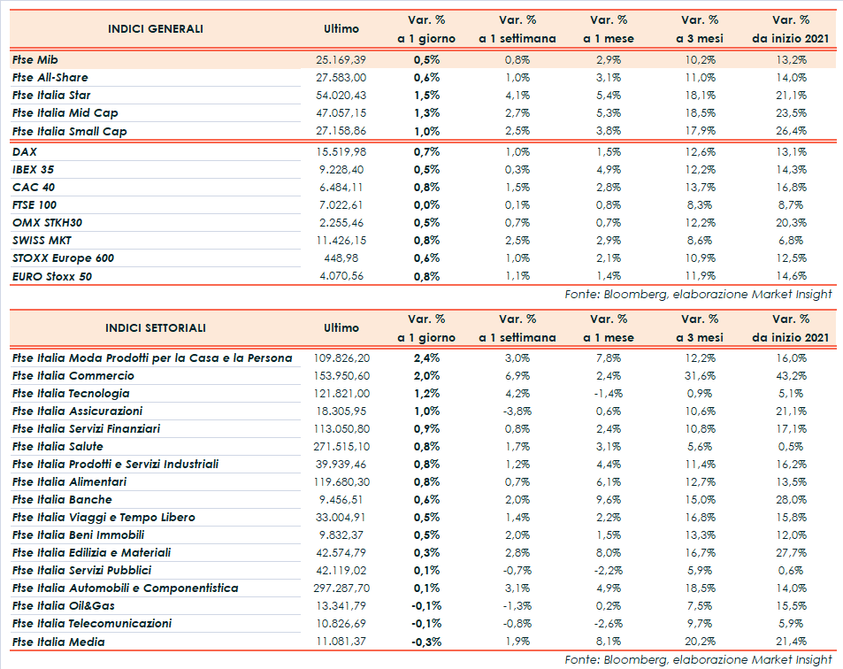 Chiusura positiva per le borse europee, mentre a Wall Street proseguono positivi Dow Jones (+0,4%), S&P500 (+0,3%) e Nasdaq (+0,5%). A Piazza Affari, il Ftse Mib archivia gli scambi in progresso dello 0,5% in area 25.169 punti, mediamente in linea con il Ftse 100 di Londra (flat), l’Ibex 35 di Madrid (+0,5%), il Dax di Francoforte (+0,7%) e il Cac 40 di Parigi (+0,8%).
