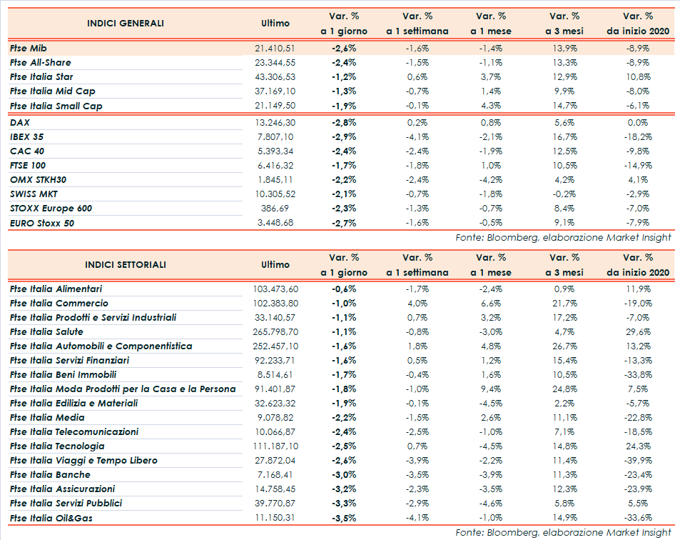 A Piazza Affari il Ftse Mib archivia gli scambi in calo del 2,6% a 21.410 punti, mediamente in linea con il Ftse 100 di Londra (-1,7%), il Cac 40 di Parigi (-2,4%), il Dax di Francoforte (-2,8%) e l’Ibex 35 di Madrid (-2,9%).
