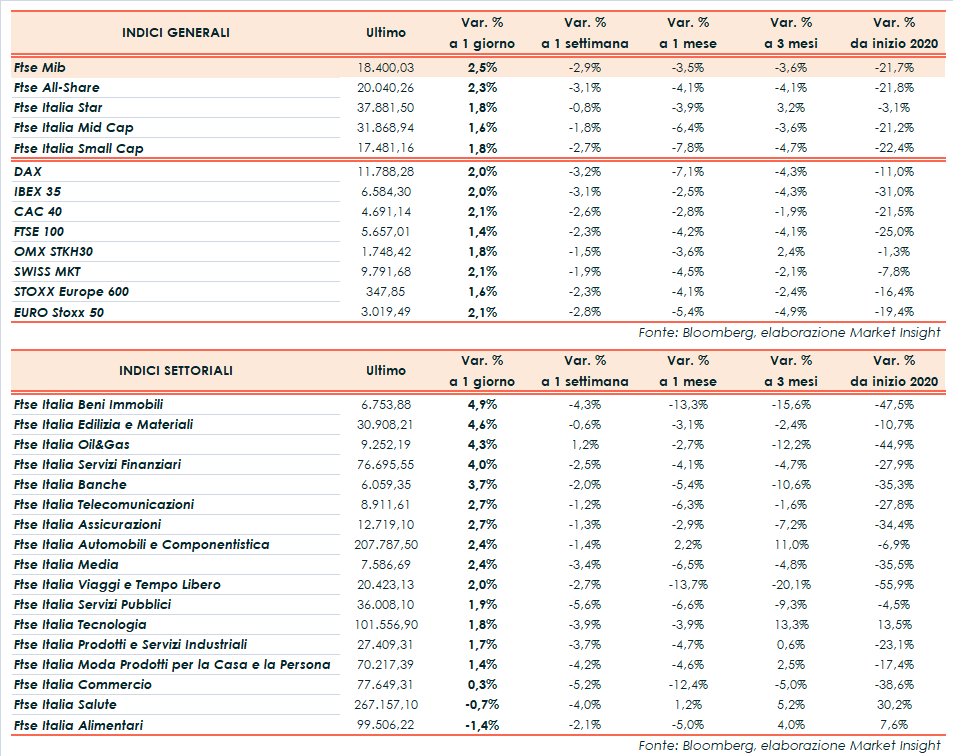 A Piazza Affari il Ftse Mib archivia gli scambi in rialzo del 2,55% a 18.400 punti, ben intonato come il Cac40 di Parigi (+2,1%), l’Ibex35 di Madrid (+2,1%), il Dax30 di Francoforte (+2,0%), e il Ftse100 di Londra (+1,5%).