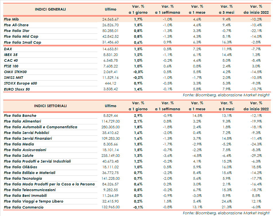 Wall Street prosegue in rialzo e le borse europee chiudono positive, con il Ftse Mib in progresso dell’1,7% a 24.565 punti. Bene anche il Dax di Francoforte (+1,3%), l’Ibex 35 di Madrid (+1,2%), il Ftse 100 di Londra (+1,0%) e il Cac 40 di Parigi (+1,0%). Oltreoceano avanzano Dow Jones (+0,4%), S&P500 (+0,7%) e Nasdaq (+0,8%), dopo i ribassi di venerdì.