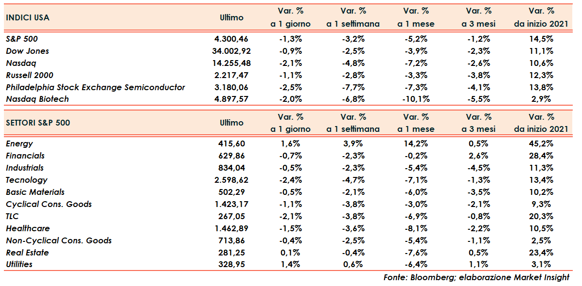 Seduta in profondo rosso ieri a Wall Street che riprende a scendere dopo il rimbalzo nel finale di ottava precedente. Malgrado un lieve colpo di reni nel finale, il quale impedisce agli indici di chiudere sui minimi intraday ed al Dow Jones ed allo S&P500 di terminare di un soffio al di sopra dei supporti psicologici a 34.000 e 4.300 punti, l’umore del mercato sembra cambiato e il famoso “buy on deep” non più così di moda come negli ultimi mesi/anni.