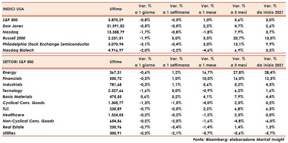Il bilancio finale registra tutti i listini sui minimi intraday con il Nasdaq (-1,6%) ed il Russell 2000 (-1,7%), i più penalizzati. Le perdite del Dow Jones e dello S&P500 si attestano, invece, entrambe allo 0,8%.