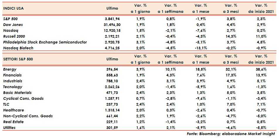 Dow Jones e S&P500 guadagnano l’1,9%, il Nasdaq un punto pe mezzo percentuale ed il Russell 2000 poco più del due.