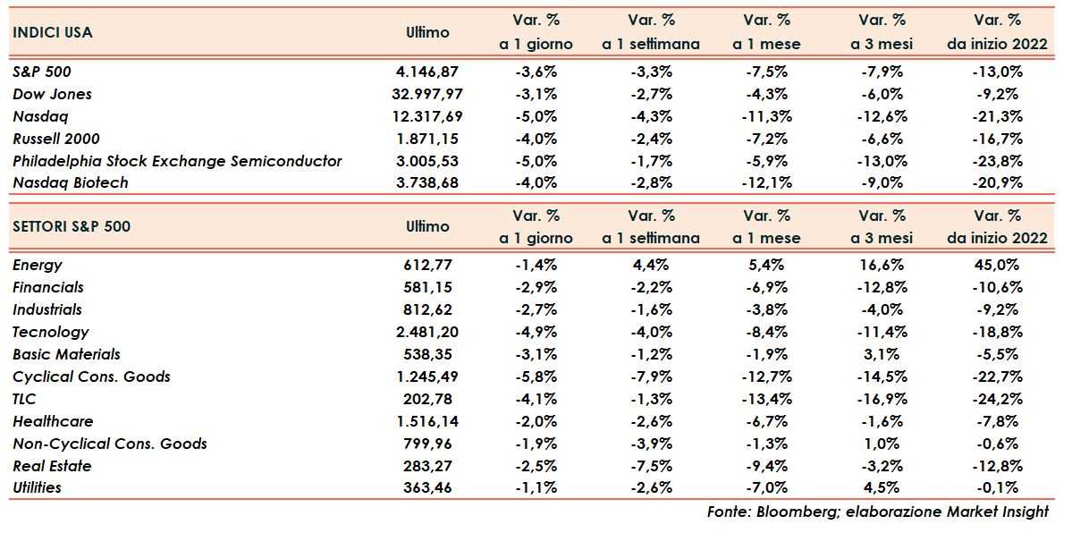 Il Russell 2000 cede il 4%, lo S&P500 il 3,6%, il Nasdaq il 5% ed il Dow Jones il 3,1%, lasciando sul terreno oltre 1.000 punti di indice.