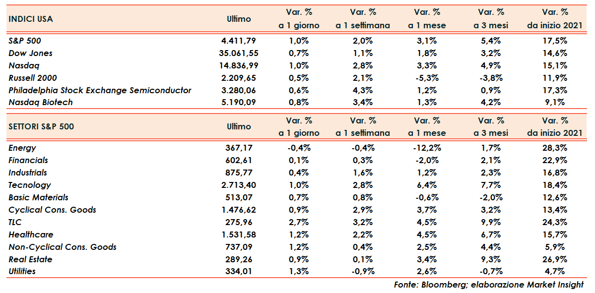 Il Dow Jones guadagna lo 0,7% e chiude al di sopra di quota 35.000 punti, lo S&P500 ed il Nasdaq salgono entrambi di un punto percentuale mentre il Russell 2000 si apprezza di poco meno di mezzo.