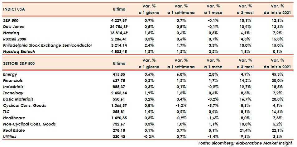 Lo S&P500 avanza dello 0,9%, Il Dow Jones di mezzo punto percentuale ed il Russell 2000 dello 0,4%.