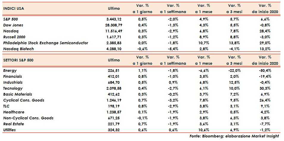 Dopo una seduta molto volatile, sempre condotta al rialzo, gli indici cedono la metà dei guadagni nel finale con incrementi molto simili dallo 0,3% del Nasdaq e del Russell 2000 fino allo 0,4% del Dow Jones per terminare con il mezzo punto percentuale dello S&P500.