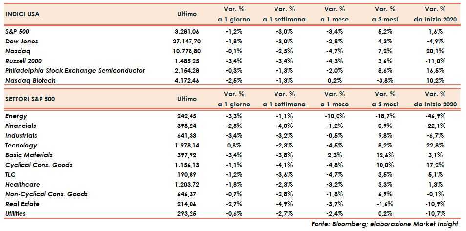 Lo S&P500 cede l’1,2%, il Dow Jones l’1,8% mentre il Russell 2000 sprofonda del tre e mezzo per cento. Resiste il Nasdaq poco sotto la parità (-0,1%).