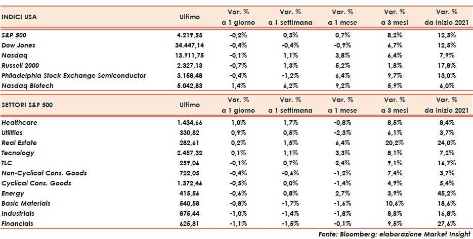 Il meno opaco risulta il Nasdaq che dopo una giornata tutta in territorio positivo termina in calo di un decimo di punto percentuale. Poco più negativo lo S&P500 (-0,2%), mentre Dow Jones (-0,4%) e Russell 2000 (-0,7%) risultano i meno brillanti.