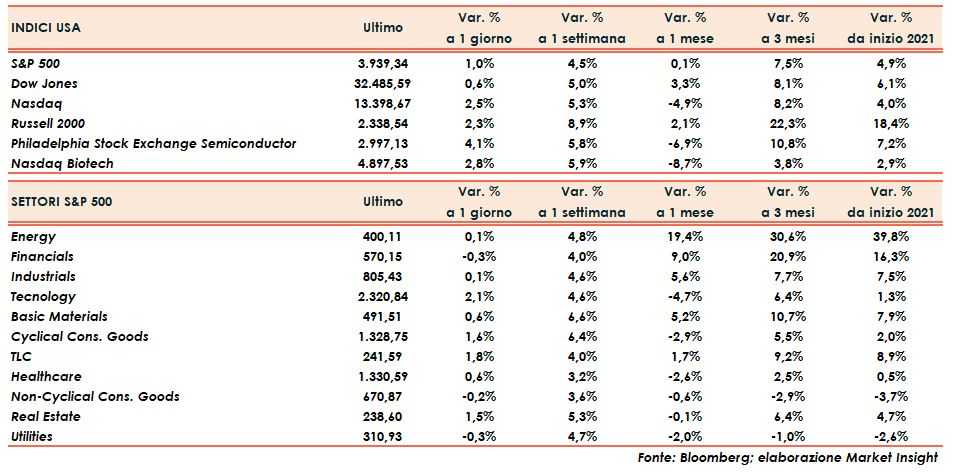 Nello specifico, Russell 2000 e Nasdaq risultano i più brillanti con progressi del 2,2% e del 2,5% e con l’indice delle small caos che recupera l’11% dai minimi di fine febbraio chiudendo ad un’inezia da un nuovo massimo storico.